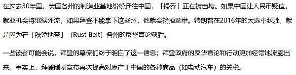中国关心的重要因素是美国对人民币疲软的反应。我稍后会讨论这个问题,但疲软的人民币会使原产于中国的商品更加便宜。这就降低了美国人转移制造能力的积极性。如果他们的最终产品在价格上仍无法与中国产品竞争,他们为什么还要建造昂贵的工厂和雇佣昂贵的熟练劳动力(如果他们能找到的话)呢?除非美国政府发放大量企业福利,否则美国制造企业将继续在国外生产。