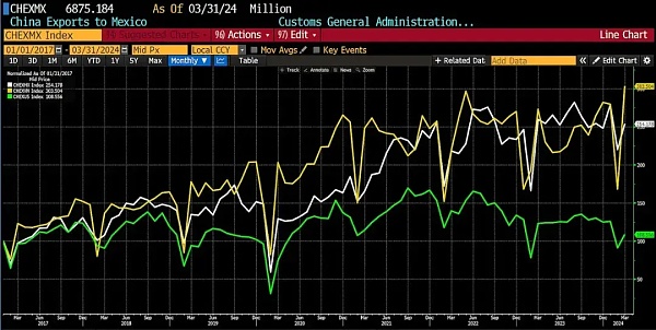 这是一张中国对墨西哥(白色)、越南(黄色)和美国(绿色)出口的图表。特朗普的统治始于 2017 年,也就是本指数以 100 值为起点的开始日期。中国与墨西哥的贸易额增长了154%,中国与越南的贸易额增长了203%,但与美国的贸易额仅增长了8%。显然,中国与美国的贸易额大大高于与墨西哥和越南的贸易额,但很明显,中国正在利用这两个国家作为商品逃避关税的中转站。