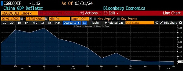 GDP平减指数将名义GDP转换为实际GDP。负数意味着价格下降,这对以债务为基础的经济不利。因为当资产价格下跌时,银行以资产抵押为回报发放信贷,债务偿还就会受到质疑,其价格也会下跌。这是致命的,这也是为什么中国和其他所有全球经济体都需要通胀才能运转的原因。