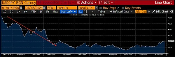 上图为美元兑日元走势图。20 世纪 70 年代初,美元兑日元的汇率为 350,可以想象当时日本商品对饱受通胀之苦的美国人来说有多便宜。