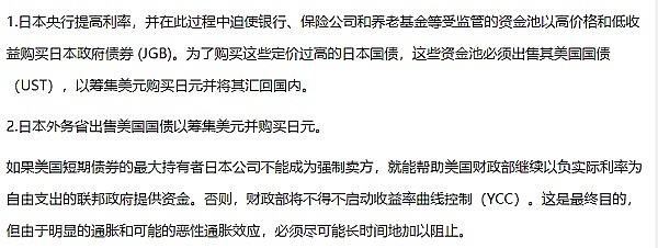 如果日本央行真的必须提高利率以缩小美元兑日元的利差,他们首先会迫使国内受监管资本(银行、保险公司和养老基金)购买日本国债。为此,这些实体将出售以美元计价的国外资产,主要是美国国债和美国短期债券,用这些美元购买日元,然后从日本央行购买负实际收益率的高价日本国债。