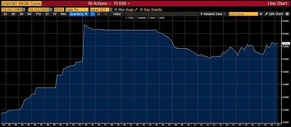 自1994年以来,中国人民银行(PBOC)基本上将人民币与美元挂钩,并略有升值倾向。这就是美元兑人民币的走势图。这种情况即将改变。