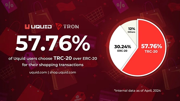 5月18日,Web3购物平台Uquid在社交媒体表示,截至2024年4月,Uquid购物者中有57.76%的用户使用TRC20-USDT进行消费。