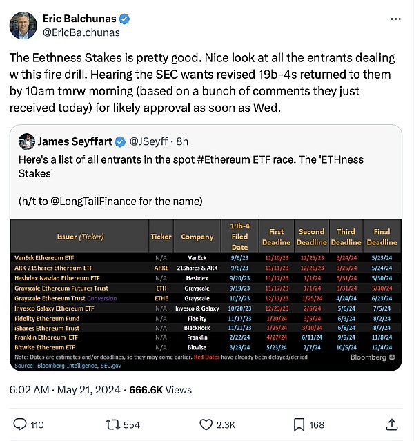 在 SEC 做出预期决定之前,加密货币市场紧张,交易者为可能的结果做好准备。值得注意的是,这一反应包括大量投机头寸的清算。彭博社分析师 Eric Balchunas 和 James Seyffart 报告称,他们升级的批准预期导致以太坊的价格在短短几个小时内从 3,140 美元跃升至 3,691 美元。 Balchunas 的推文强调了 SEC 对修订 19b-4 表格的紧急请求,预计可能会在周三获得批准。