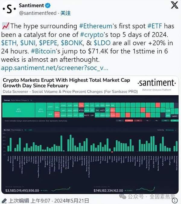 在过去的24小时内,包括ETH、UNI、PEPE、BONK和LDO在内的几种顶级加密货币的涨幅均超过20%。