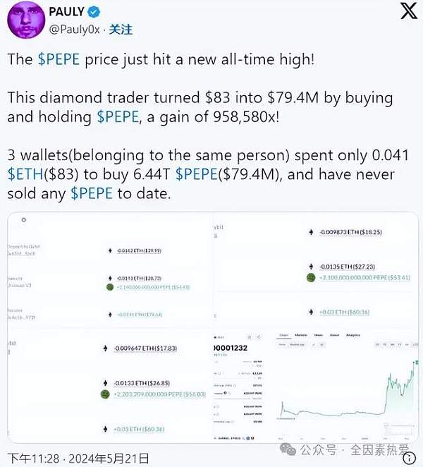 PEPE 反弹中一个值得注意的成功故事是,一位交易员通过购买并持有 PEPE,将区区 83 美元变成了惊人的 7940 万美元,实现了其初始投资的 958,580 倍的收益。此人仅花费 0.041 美元 ETH,利用三个钱包积累了 6.44 万亿美元 PEPE 代币,购买时价值 83 美元。