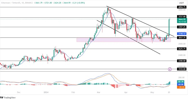 在现货ETF待批社会情绪大幅上涨后,以太坊价格成功突破下跌通道格局。这导致 ETH 代币在自 3 月中旬以来一直处于负面模式后,在一维时间范围内录得突破性反弹。