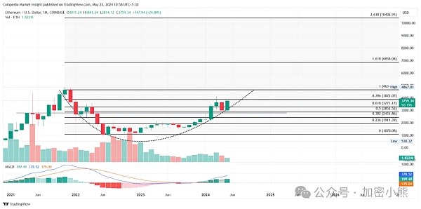 月线图中,ETH价格走势的牛市形成圆底形态。这一看涨趋势延续模式的颈线位于 4635 美元。目前,随着大盘复苏,牛市卷土重来,意味着突破的可能性很大。