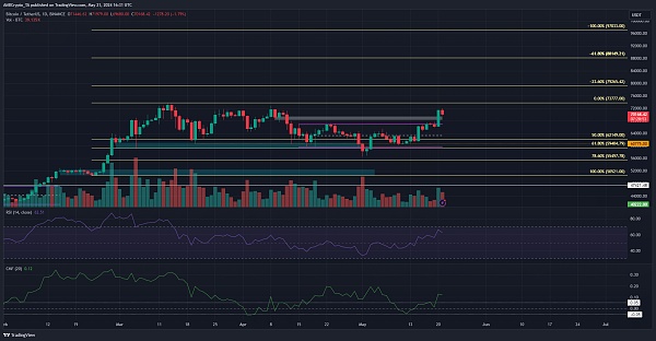 局部范围(紫色)和不平衡(白色)都被令人信服地打破了。如果这种势头持续下去,73,700 美元的高点可能很快就会被扫除。