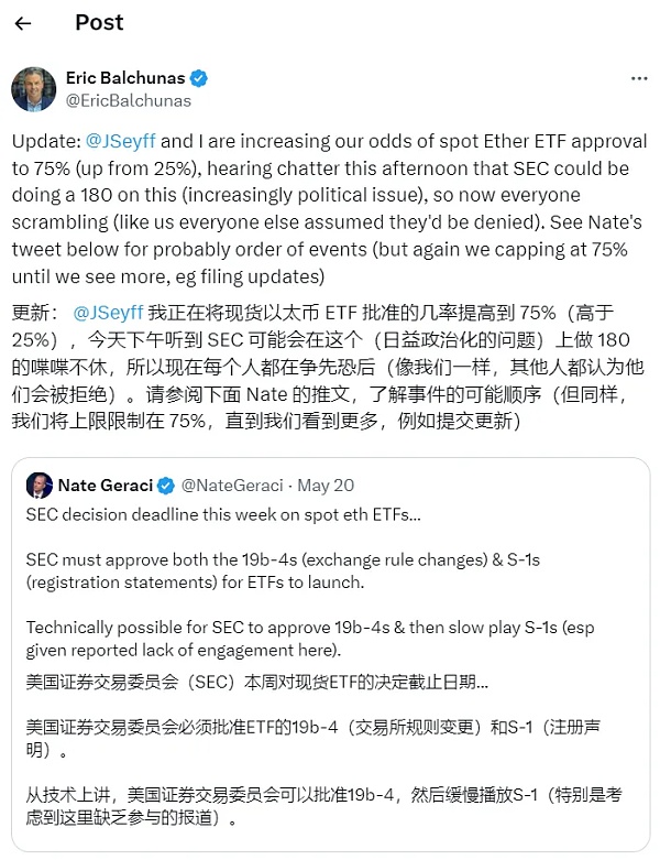 Bloomberg Intelligence ETF 分析师 Eric Balchunas 和 James Seyffart 在随后的更新中表示,今天下午听到有人议论 SEC 可能会对以太坊现货 ETF 做出 180 度转变(更多的是政治问题),这一可能性与 19b-4(证券交易所规则变更提案)的批准有关。