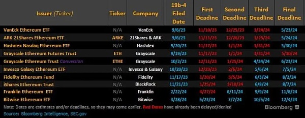 根据 James Seyffart 统计,当前以太坊现货 ETF 申请公司包括 VanEck、21Shares&ARK、Hashdex、Grayscale、Invesco&Galaxy、Fidelity(富达)、BlackRock(贝莱德)、Franklin、Bitwise。