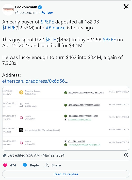 一位早期的 PEPE 投资者采取了一项战略举措,将他持有的全部 1829 亿 PEPE(价值 253 万美元)存入了一个金融账户。这笔持股源于去年以 462 美元的价格购买了 3249 亿 PEPE,总利润超过 340 万美元。
