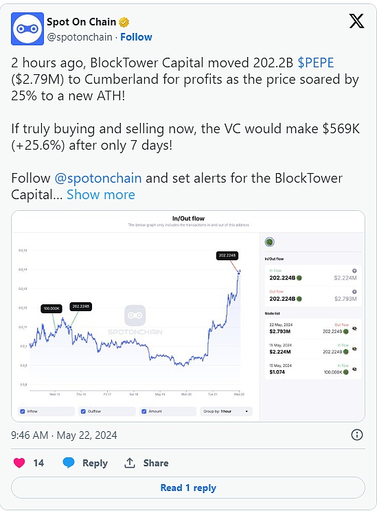 机构投资者也关注到了PEPE市场,机构投资公司BlockTower Capital通过精心策划的PEPE交易引起轰动。