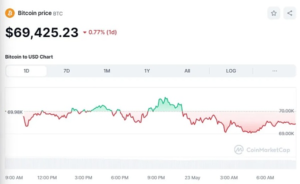 截至今天 5 月 23 日,比特币的价格图表显示出高度波动,目前价格为 69,425.23 美元,过去 24 小时内下跌了 0.77%。其24小时最低价为 68,977.69 美元,最高价为 70,623.69 美元。