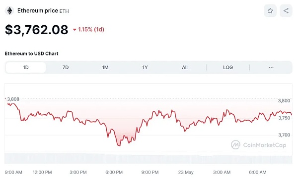 以太坊 (ETH) 的价格在过去 24 小时内下跌了 1.15%,目前为 3,762 美元。其 24 小时最低价为 3,655.08 美元,最高价为 3,810.95 美元。