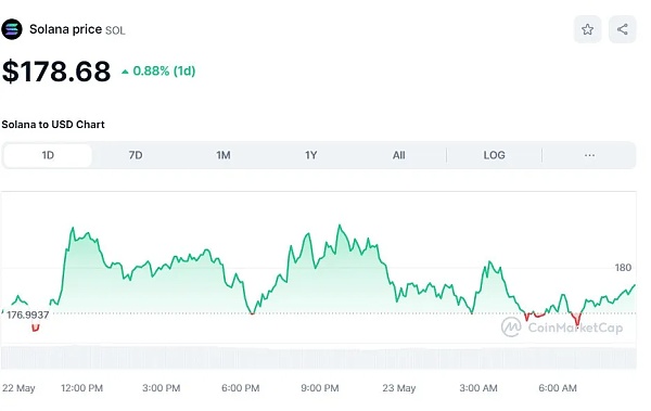 与之相反,Solana (SOL) 的价格在过去 24 小时内上涨了 0.88%,达到 178.68 美元。尽管 SOL 的走势波动,但该代币仍保持上涨势头。其 24 小时最低价为 175.45 美元,最高价为 183.07 美元。同时,24 小时交易量下降 7.19%,降至 37.7 亿美元。