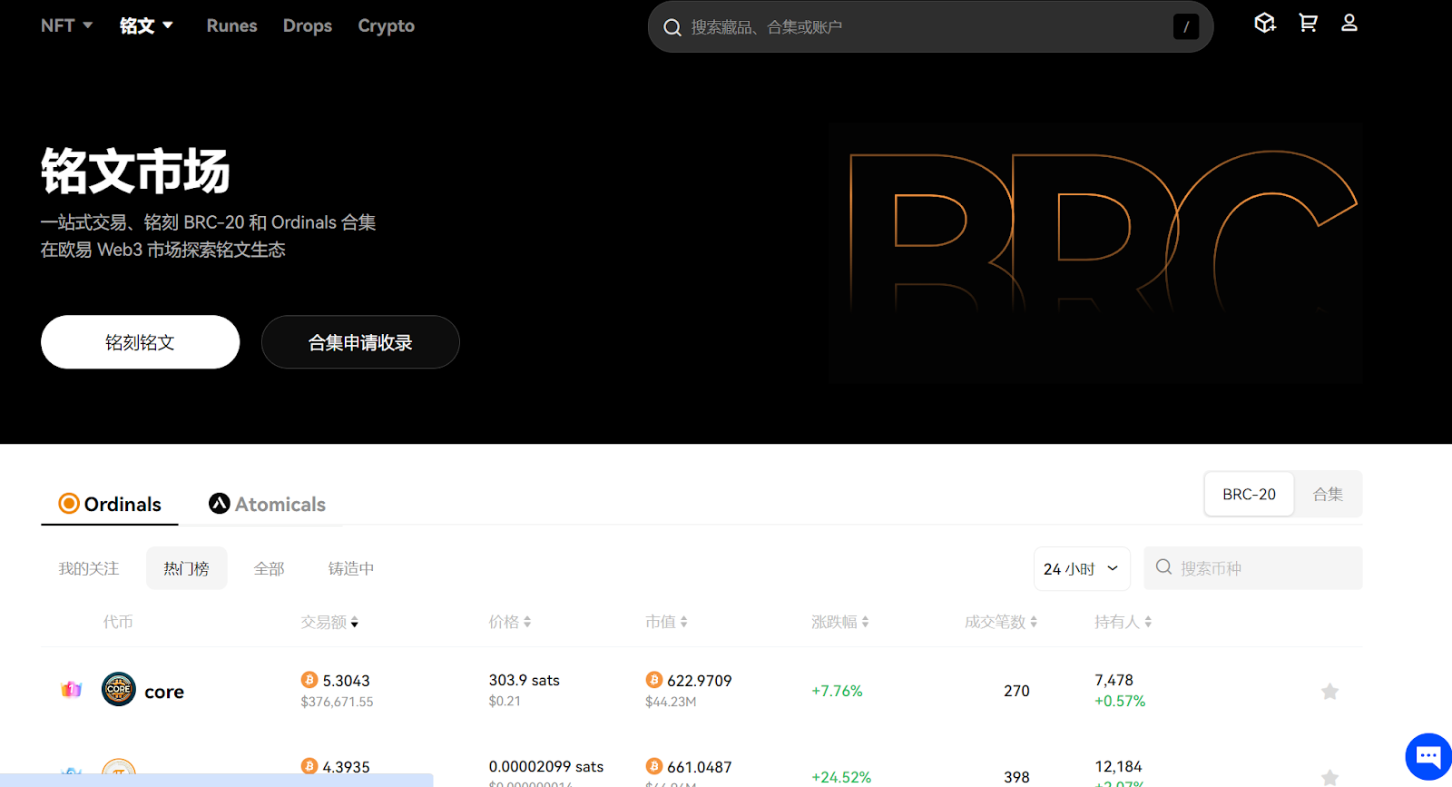 OKX Web3 团队同时也将重心放在资产发行协议及应用层基础设施的建设。除了率先支持 Ordinals 市场外,OKX Web3 钱包还逐步集成 ARC-20、SRC-20、Runes 等铭文代币标准,为数百万用户提供零手续费的铭文买卖服务。用户可通过 OKX 铭文市场进行 BRC-20、ARC-20 等资产的购买和挂单出售,享受无手续费的交易体验。此外,还可在 OKX NFT 市场免费 mint 和交易 BTC NFT。