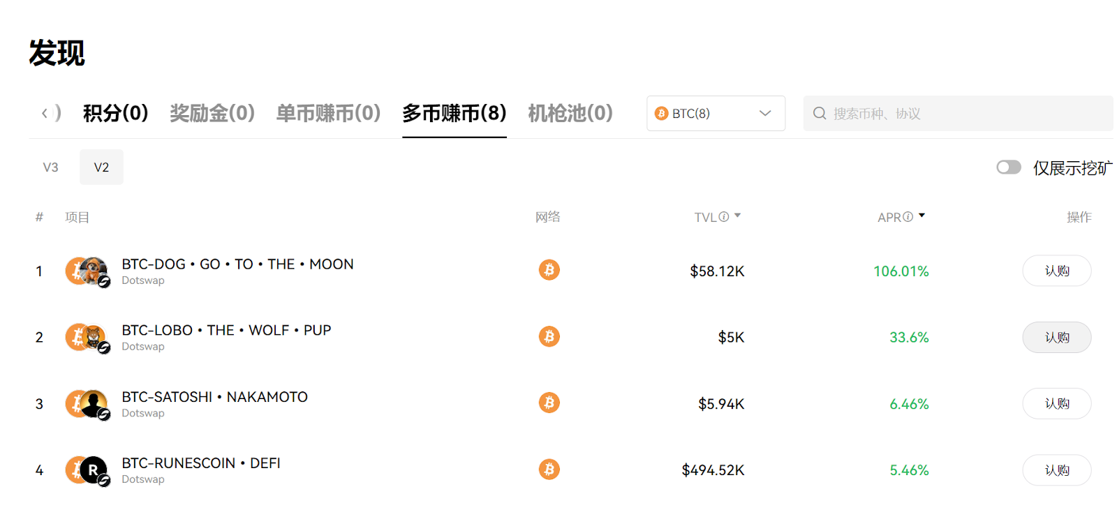 在 OKX Web3 钱包的 DeFi 一栏中,用户可以找到目前相对热门、质押收益较高的项目,进行比特币资产的链上质押,以更低 Gas 赚取链上收益。或者也可以参与 OKX DeFi 不定期推出的加息活动,增加收益等。