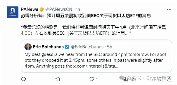 大家可以注意今天以太坊 ETF 公布的消息,如果通过将开启第二轮行情,ETH可能直接突破4000+,山寨现货都会同比反弹!