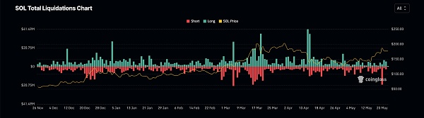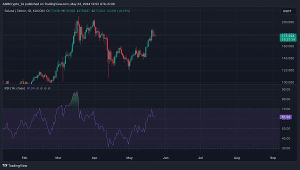 在 5 月 21 日,该山寨币的价格攀升至一个月高点 187.83 美元后,它开始下跌,迄今已下跌 6%。根据CoinMarketCap 的数据,截至本文撰写时,SOL 的交易价格为 177 美元。