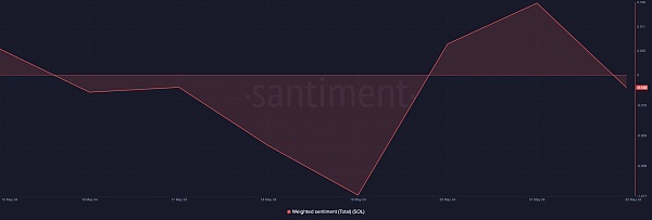 随着抛售压力的增加,该代币的加权情绪从正面转为负面,证实了市场情绪从看涨转为看跌。根据Santiment 的数据,截至本文撰写时,SOL 的加权情绪为 -0.13。