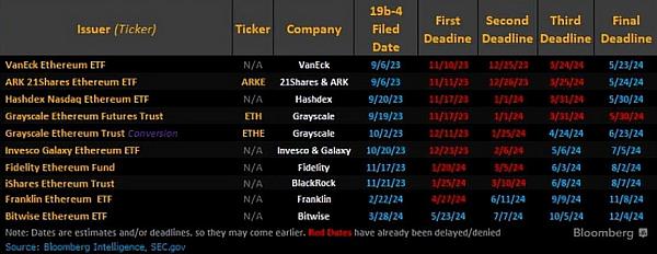 2023年9月6日,VanEck和21Shares&ARK率先向SEC递交了以太坊现货ETF的申请,随后,以太坊现货ETF迎来了密集的机构申请潮,Hashdex、Grayscale、Invesco&Galaxy、Fidelity、BlackRock相继递交,而Franklin和Bitwise则相对保守,在比特币现货ETF通过后的今年2月份之后才进行申请,成为了申请队列中的最后梯队。