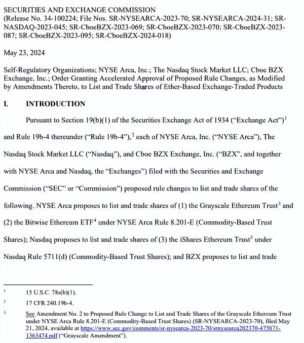 事实正如市场所料,时间来到5月24日,据官方文件显示,美国证券交易委员会(SEC)已批准纽交所、芝加哥期权交易所、纳斯达克关于现货以太坊ETF的计划,即发行人的以太坊现货ETF 19b-4(交易所规则变更)申请。