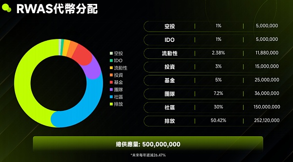 RWAS最大发行量为5亿枚,生态排放模块的代币占比为50.42%,约2.522亿枚。根据排放计划,第一年为6673.6164 万RWAS,后续每年排放递减26.47%。其中LP池排放占比40%,首年约2669万枚RWAS,即LP挖矿每日奖池73136枚。