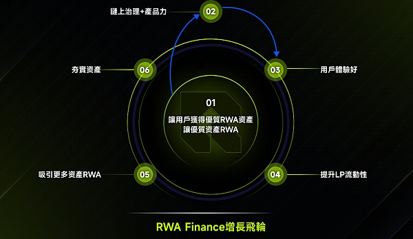 RWA Finance增长飞轮战略六部曲,描绘出RWA赛道中宏大的RWAS叙事。让用户获得优质RWA资产、让优质资产RWA;链上治理+产品力;用户体验好;提升LP流动性;吸引更多资产RWA;夯实资产。当前阶段,RWA Finance正通过VE治理模型让用户获得更多RWA优质资产;同时,围绕产品力的全面提升,赋能更多优质的真实世界资产进入WEB3世界流通。在此进程中,RWAS围绕流动性提供者(LP)进行持续的权益赋能。