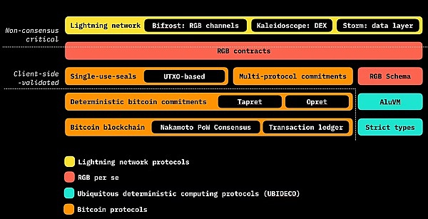 RGB 是在比特币区块链的PoW共识层上构建的协议。该协议是有向无环图(DAG)的一个版本,参与者无法看到网络的完整状态,每笔新交易都需要至少两笔先前交易的确认,才能记录在网络上。客户端验证由 RGB 模式提供支持。