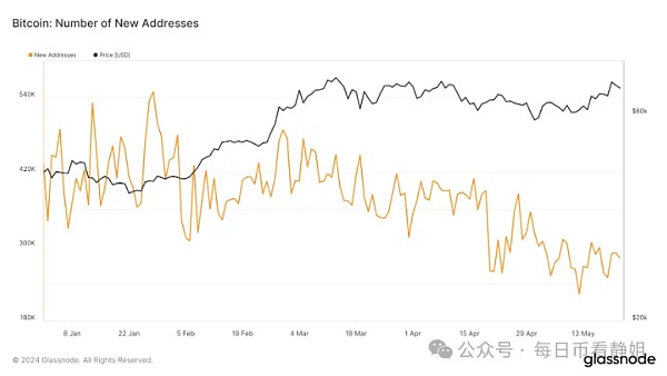 Glassnode 的数据进一步显示,新地址数量也在下降,形成了高点和低点不断走低的格局。这支持了 Check 的观点,即比特币市场尚未达到狂热状态,这通常预示着市场过热。