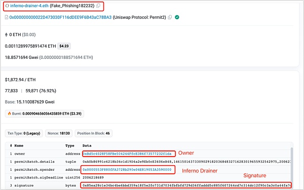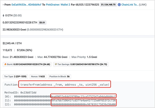 补充说明:这里攻击者接收资产的地址通常有多个,通常其中一个金额最大的接收者是实施钓鱼的攻击者,另外的则是提供钓鱼即服务的黑产地址(钓鱼即服务DaaS的供应商地址,例如PinkDrainer、InfernoDrainer、AngelDrainer等)。