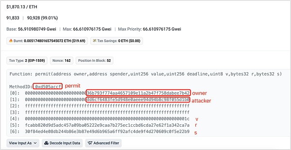 补充说明:这种签名是一个无Gas的链下签名,攻击者拿到后会执行permit和transferFrom链上交互,所以在受害人地址的链上记录中看不到授权记录,在攻击者地址中可以看到。一般来说这种签名是一次性的,不会重复或持续产生钓鱼风险。