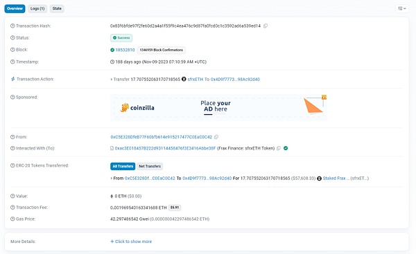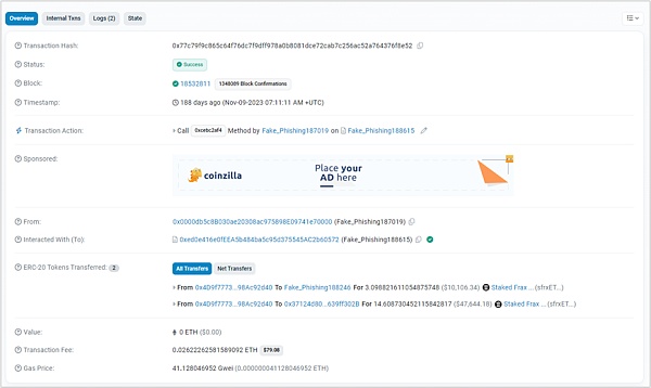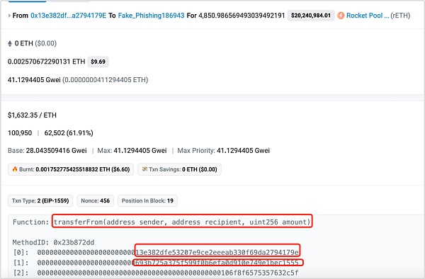 在这笔交易中,受害者把地址中的sfrxETH转给了恶意地址(0x4D9f77),该地址是一个新的合约地址,没有任何交易记录。
