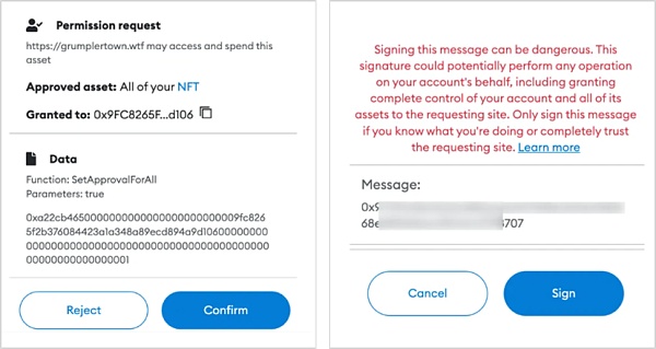 攻击者通过伪造恶意网站,或者在项目官网上挂马,诱导用户对setApprovalForAll、Approve、Increase Approval、Increase Allowance等操作进行确认,获取用户的资产操作授权并实施盗窃。