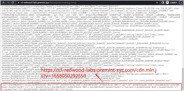 以PREMINT挂马钓鱼事件为例,项目方网站上的一个js文件(https://s3-redwood-labs.premint.xyz/theme/js/boomerang.min.js)被注入了恶意代码,执行后会动态创建注入恶意js文件(https://s3-redwood-labs-premint-xyz.com/cdn.min.js?v=1658050292559)。攻击由这个恶意脚本发起。