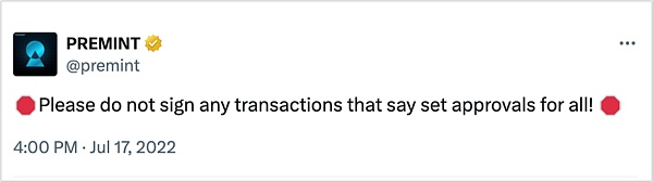 用户因未及时发现风险,对setApprovalForAll操作进行了确认,无意间泄漏了对资产的操作授权,导致资产被盗。