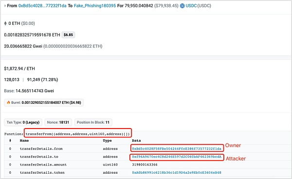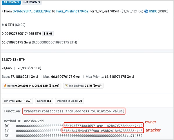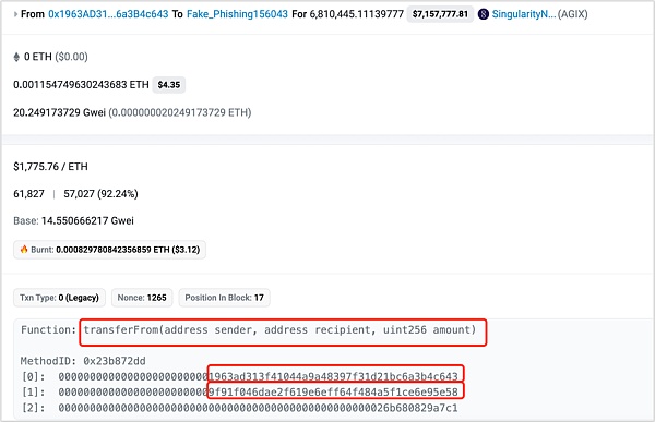 但是打开这个合约的创建交易可以发现,该合约在创建的同时完成了钓鱼攻击,将资产从受害者地址转出。