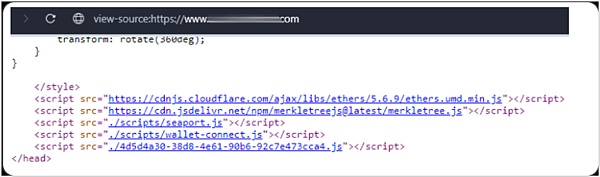 该网站的 head 部分包含seaport.js 和 wallet-connect.js两个恶意脚本。Inferno Drainer 钓鱼网站的另一个典型特征是用户无法通过鼠标右键打开网站源代码,这使得这些钓鱼网站的隐蔽性更高。