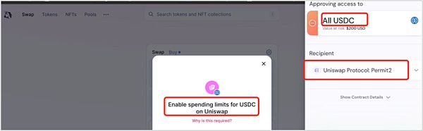 (1)前提条件是用户的钱包在被钓鱼之前已使用过Uniswap并将代币额度授权给了Uniswap的Permit2合约(Permit2默认会让用户授权该代币的全部余额的额度)。