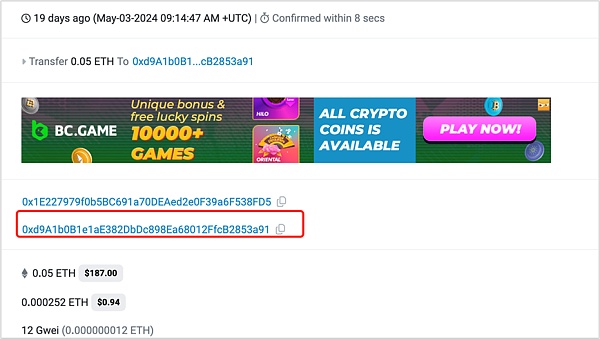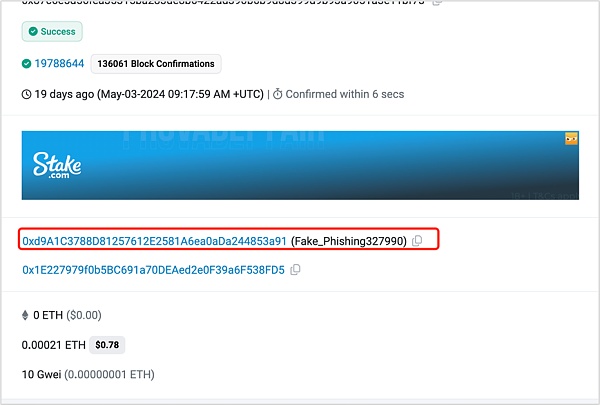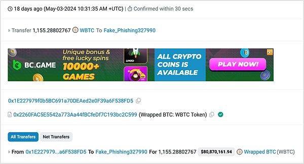 2024年5月3日就因为此地址污染钓鱼手法被钓鱼1155WBTC,价值超过7千万美元。