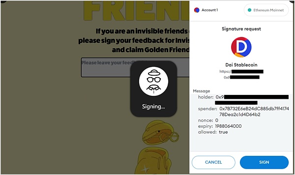 (2)攻击者伪造钓鱼链接或钓鱼页面,诱导用户进行签名,钓鱼攻击者获取所需的签名信息,和Permit链下签名钓鱼类似。