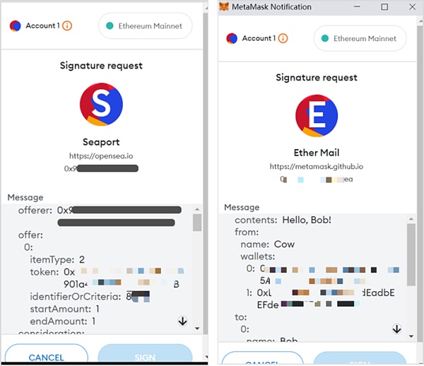 此外,如果像上面这种情况personal_sign、signTypedData被用成“盲签”,用户看不到明文,容易被钓鱼团伙利用,也会增加钓鱼风险。
