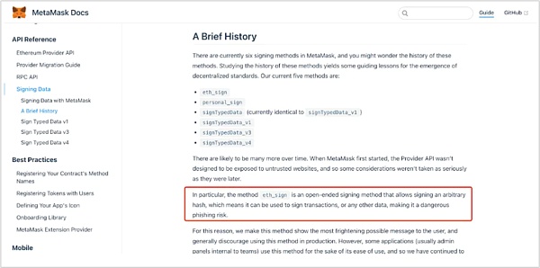 MetaMask在进行eth_sign签名时会有风险提示,imToken、OneKey等Web3钱包均已禁用此函数或提供风险提示,建议所有钱包厂商禁用此方法,防止用户因缺乏安全意识或必要的技术积累被攻击。