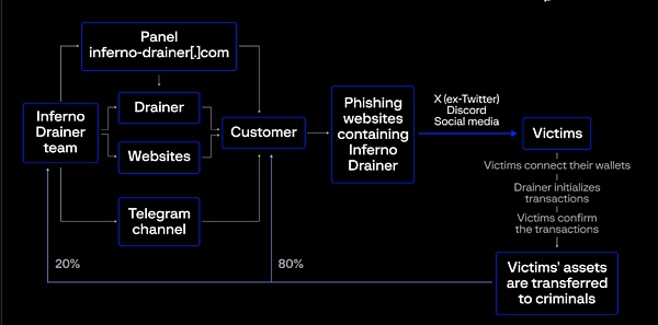 那么,这种DaaS骗局是如何运行的,下图是Inferno Drainer 的加密诈骗方案的分步描述:
