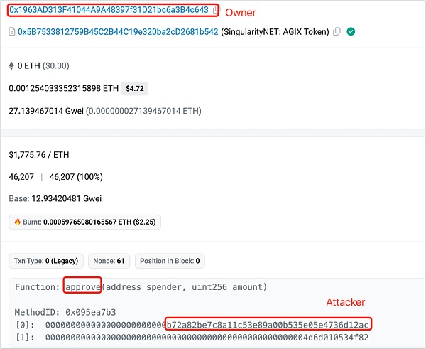 (3)攻击者调用transferFrom函数,将受害者资产转出,完成攻击。