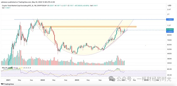 如上图所示,山寨币市值似乎正在经历抛物线复苏,非常接近曲线的颈线。此外,该水平已从上升楔形的较低支撑位反弹,这表明巨大的看涨走势可能即将到来。然而,交易价格在 1.11 万亿美元左右,需要进入 1.21 万亿美元至 1.26 万亿美元之间的关键阻力区,才能开启新的看涨期。