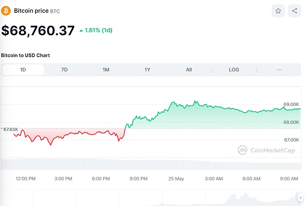 5 月 25 日,比特币价格为 68,731.33 美元,较昨日上涨 1.55%。该代币的市值为 1.35 万亿美元,24 小时交易量为 271 亿美元。其 24 小时低点和高点分别为 66,622.67 美元和 69,220.29 美元。