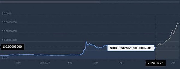 根据 CoinCodex 的数据,SHIB 的走势可能很快就会改变。该平台预计 SHIB 将在 2024 年 5 月 26 日星期日达到 0.00002581 美元。从当前水平达到 0.00002581 美元将意味着增长约 8.08%。此外,CoinCodex 预测 Shiba Inu (SHIB) 将在 6 月继续上涨,在 2024 年 6 月 21 日达到 0.00008312 美元。从当前水平达到 0.00008312 美元将意味着增长约 248%。