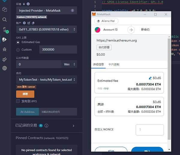 编译完成后点左侧的部署按钮,选择环境为Injected Provider -Metamask,使用Metamask钱包登录,并点橙色的部署按钮,等待Metamask弹窗,并进行确认
